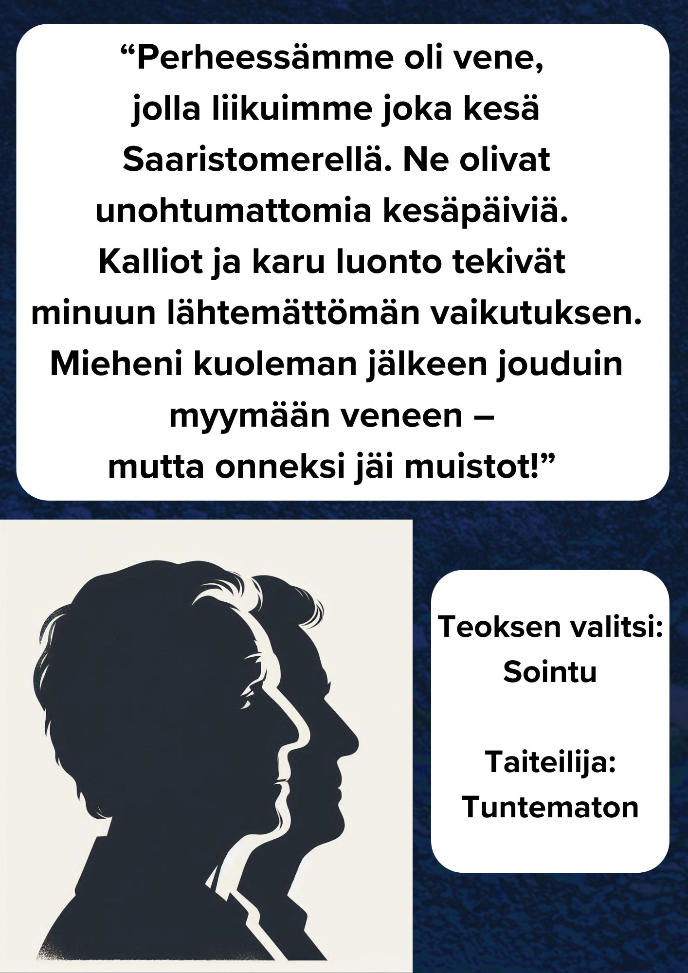 ”Teos tuo mieleen sataman, pimeän ilman. Muistuttaa omia aikoja merimiehenä, tulee mieleen oma työ.”